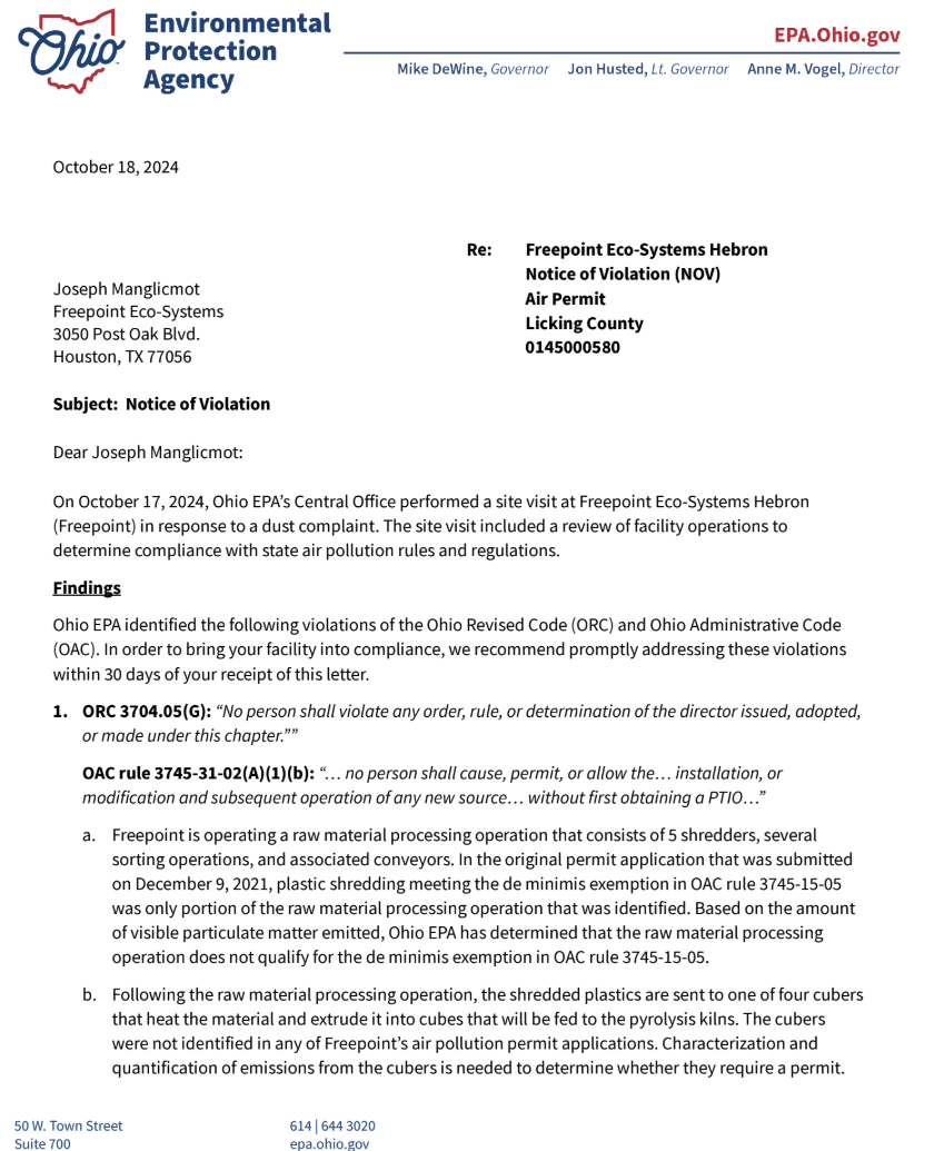First page of the OEPA's notice of violation to Freepoint Eco-System.
