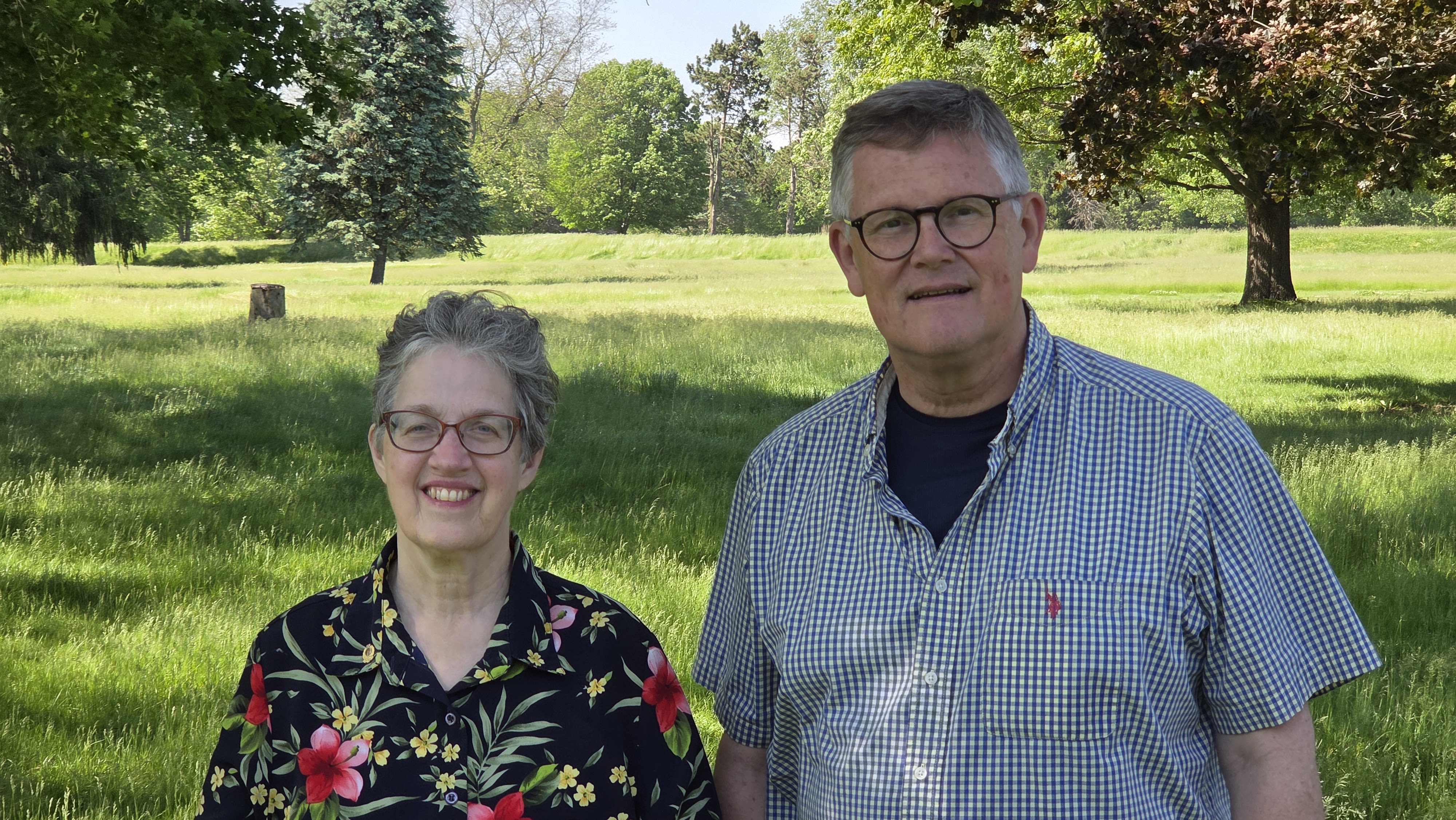 Lama Kathy Wesley and Pastor Jeff Gill under a black oak in the Octagon Earthworks. Photo by Doug Swift.